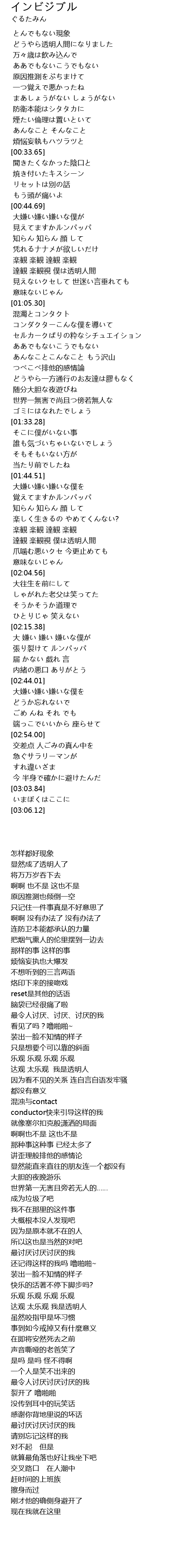 | [01:57.03] | 達観 楽観視 僕は透明人間 |