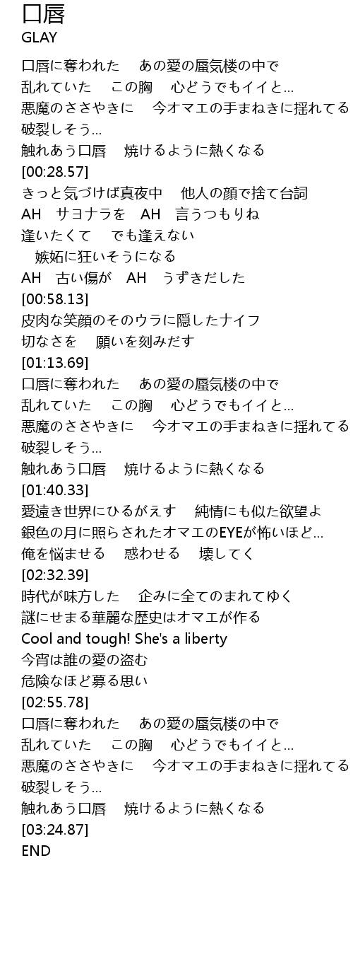 | [00:20.40] | 触れあう口唇 焼けるように熱くなる |