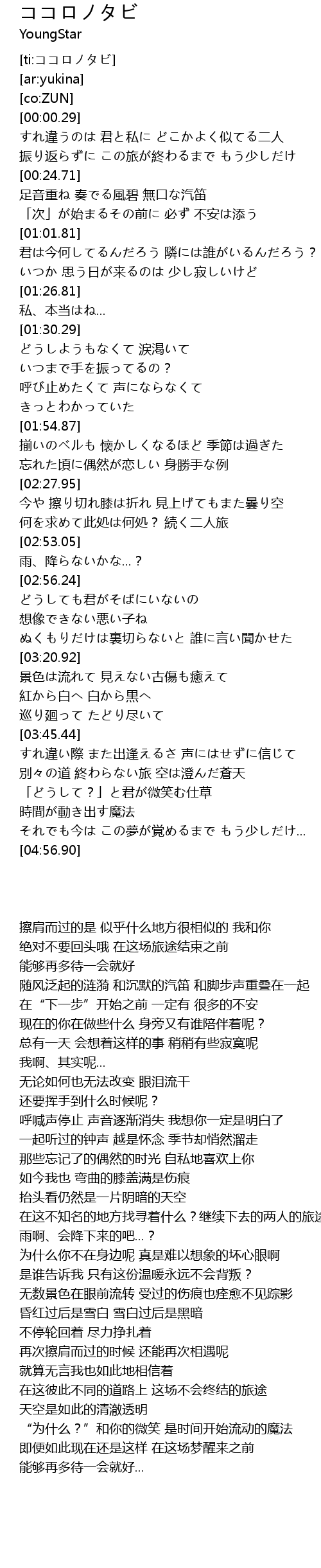 | [00:38.33] | 足音重ね 奏でる風碧 無口な汽笛 |