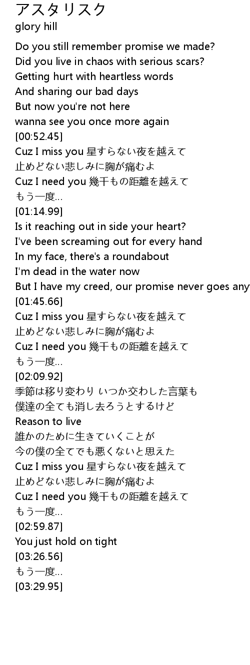 | [00:53.04] | Cuz I miss you 星すらない夜を越えて |