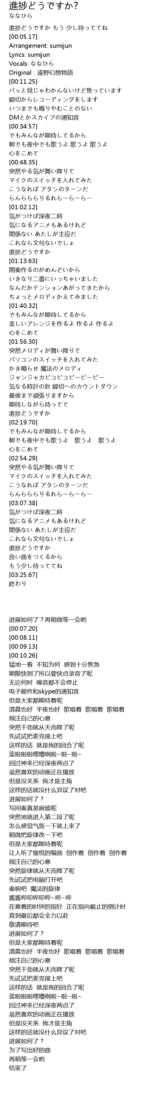 | [00:00.00] | 進捗どうですか もう 少し待っててね |