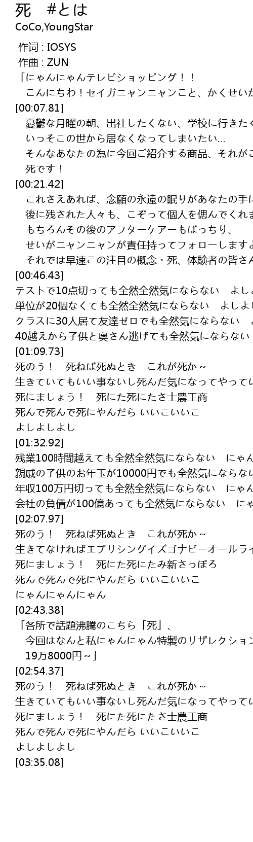 | [02:36.82] | 死んで死んで死にやんだら いいこいいこ にゃんにゃんにゃん |