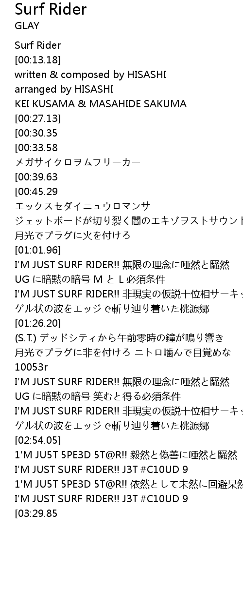 | [02:59.44] | I' M JUST SURF RIDER!! J3T C10UD 9 |