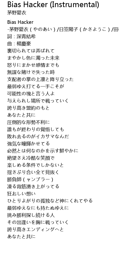 | [00:00.00] | Bias Hacker -茅野愛衣(やのあい)/日笠陽子(かさようこ)/田村由香里(村ゆかり) |