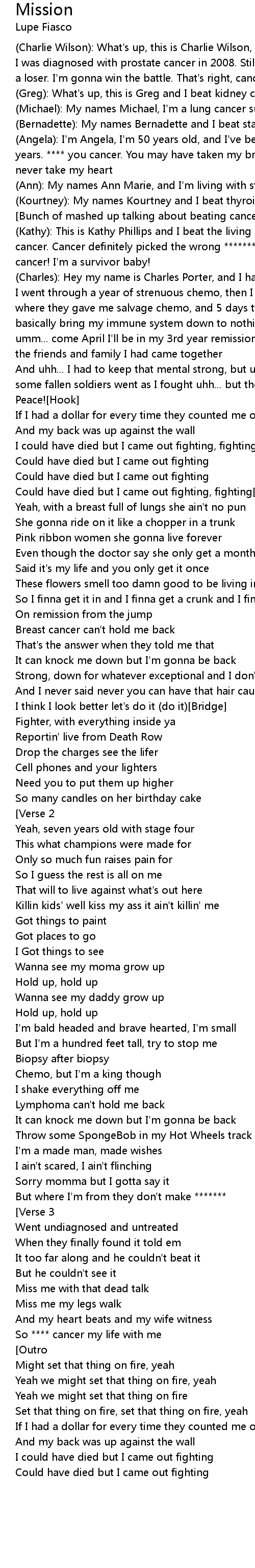 [Bunch of mashed up talking about beating cancer] |