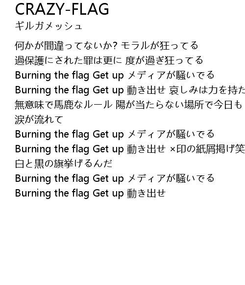 | Burning the flag Get up 動き出せ ×印の紙屑掲げ笑い 白と黒の旗挙げるんだ | |