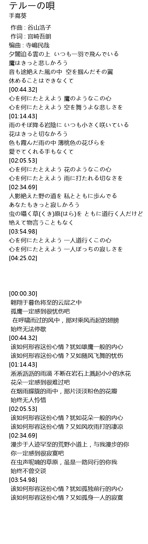 | [00:44.33] | 心を何にたとえよう 鷹のようなこの心 |