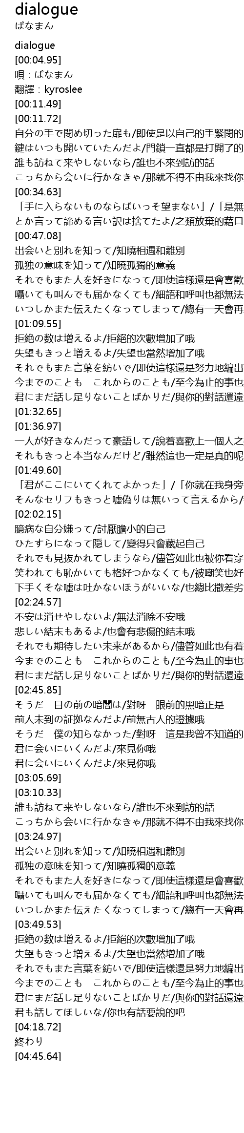 | [04:04.91] | 君にまだ話し足りないことばかりだ/與你的對話還遠遠不足夠呀 |
