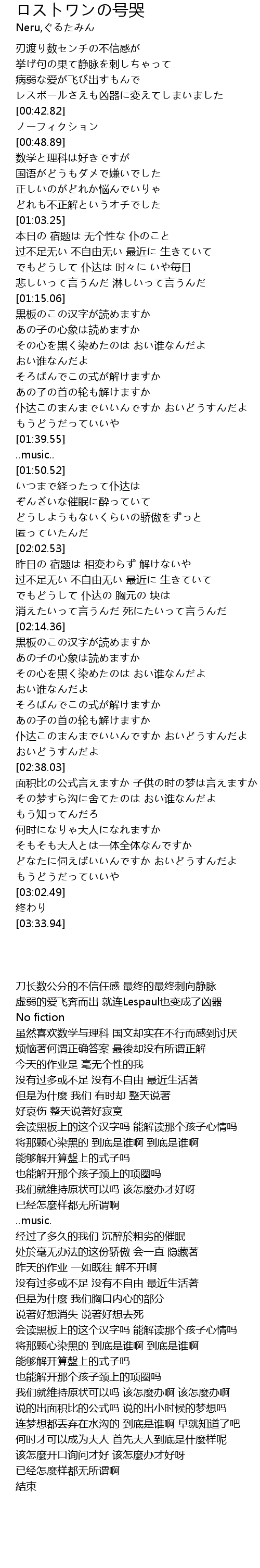 | [02:44.23] | その梦すら沟に舍てたのは おい谁なんだよ もう知ってんだろ |