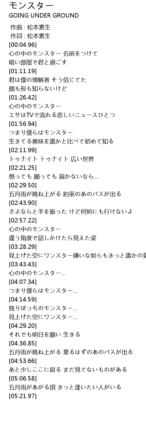 | [01:59.73] | つまり僕らはモンスター 生きてる意味を誰かと比べて初めて知る |