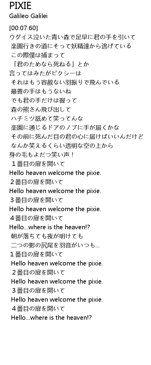 | [01:37.70] | Hello heaven welcome the pixie. |
