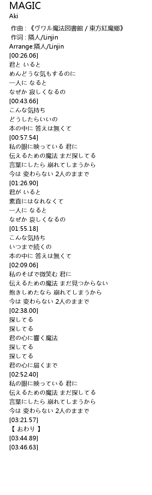 | [02:59.82] | 伝えるための魔法 まだ探してる |