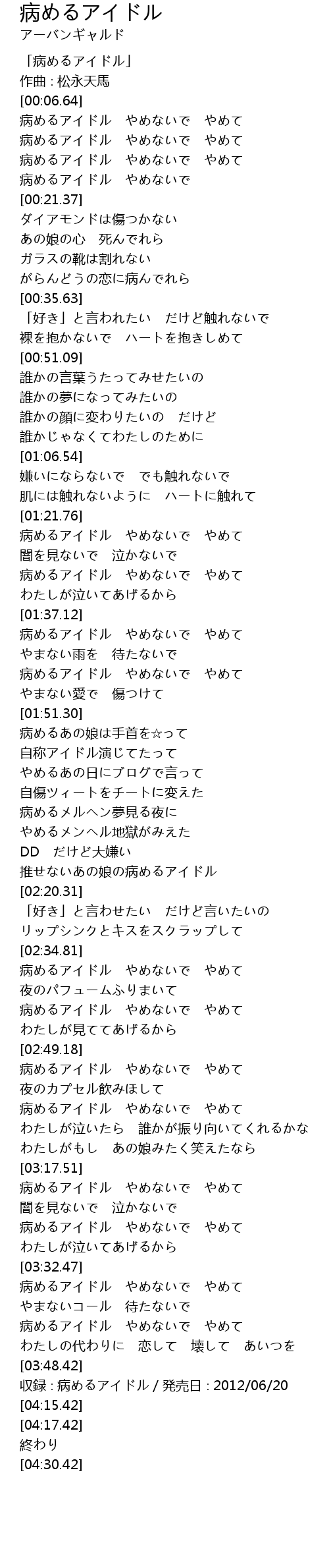 | [00:11.29] | 病めるアイドル やめないで やめて |
