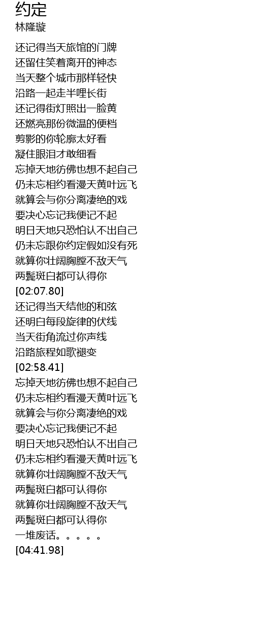 | [01:47.77] | réng wèi wàng gēn nǐ yuē dìng jiǎ rú méi yǒu sǐ |