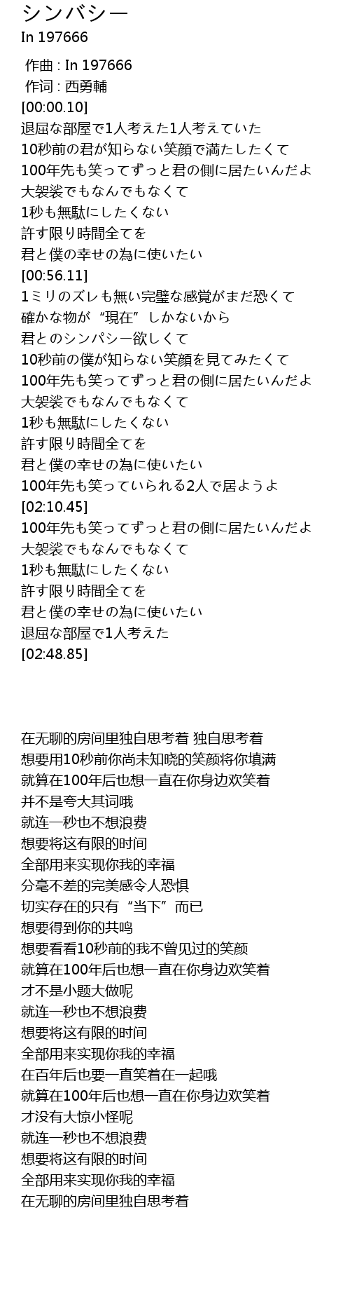 | [00:23.67] | 想要用10秒前你尚未知晓的笑颜将你填满 |