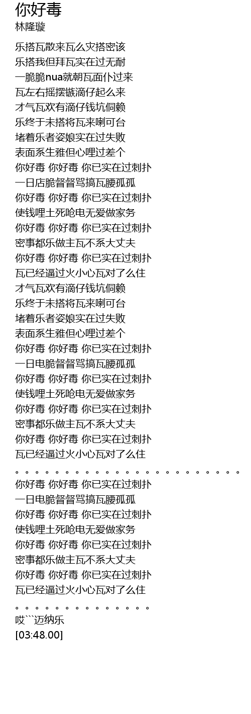 | [03:03.00] | nǐ hǎo dú nǐ hǎo dú nǐ yǐ shí zài guò cì pū |