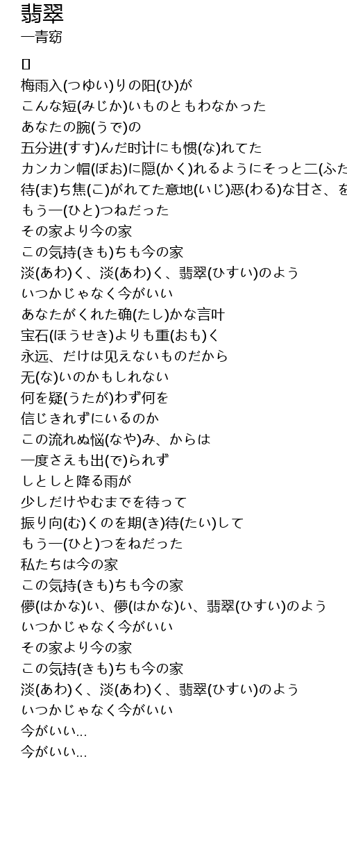 | [03:35.243] | 儚(はかな)い、儚(はかな)い、翡翠(ひすい)のよう |