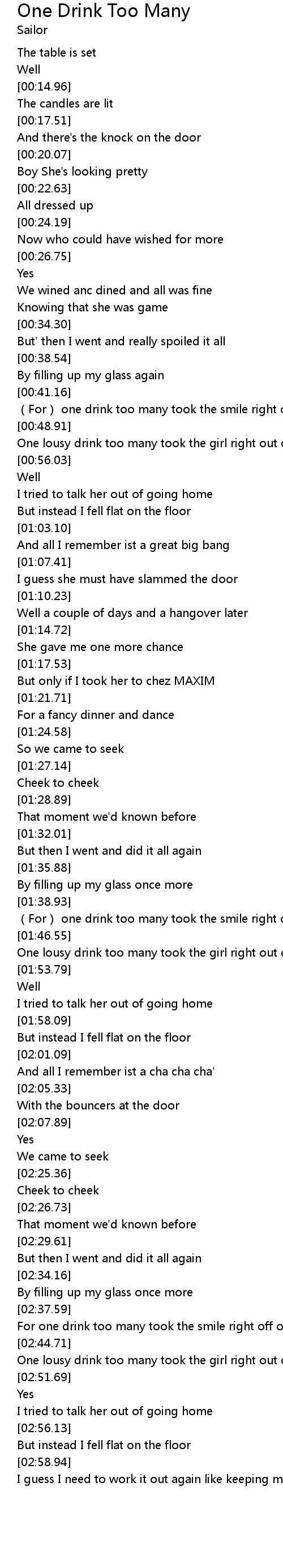 | [00:42.97] | (For) one drink too many took the smile right off of her face |