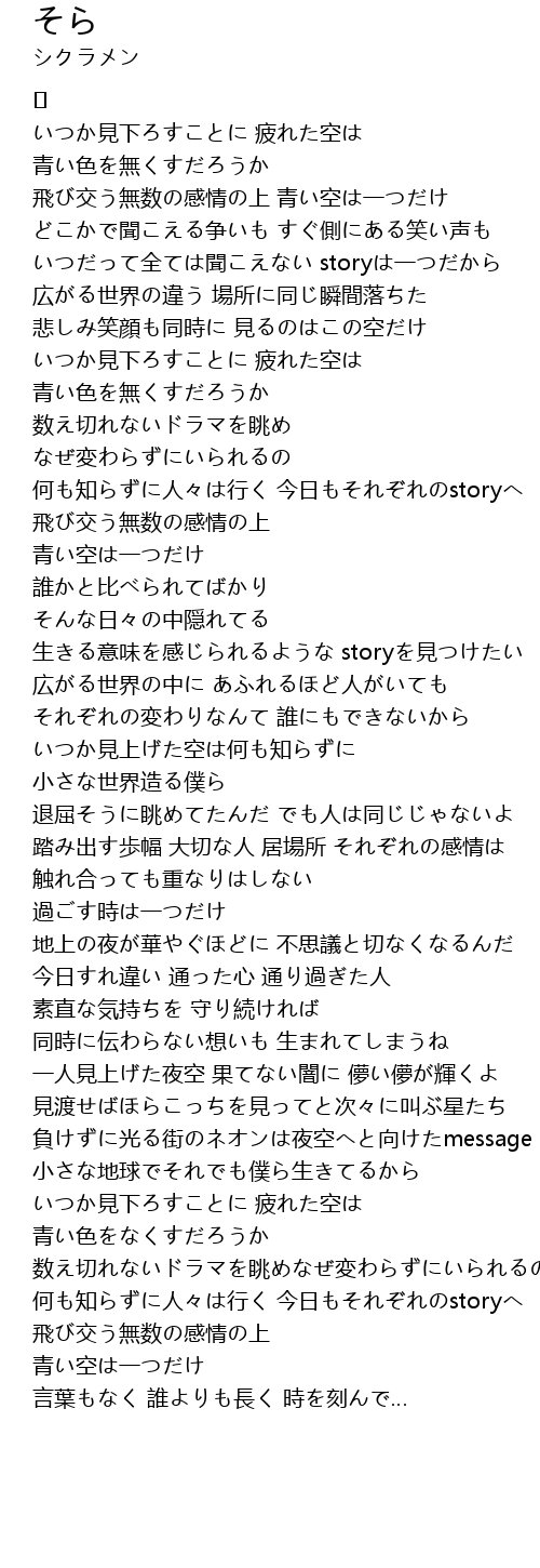 | [00:07.535] | 飛び交う無数の感情の上 青い空は一つだけ |