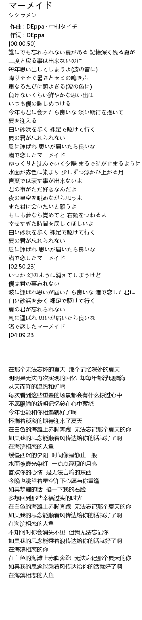 | [02:33.93] | 風に運ばれ 思いが届いたら良いな 渚で恋したマーメイド |