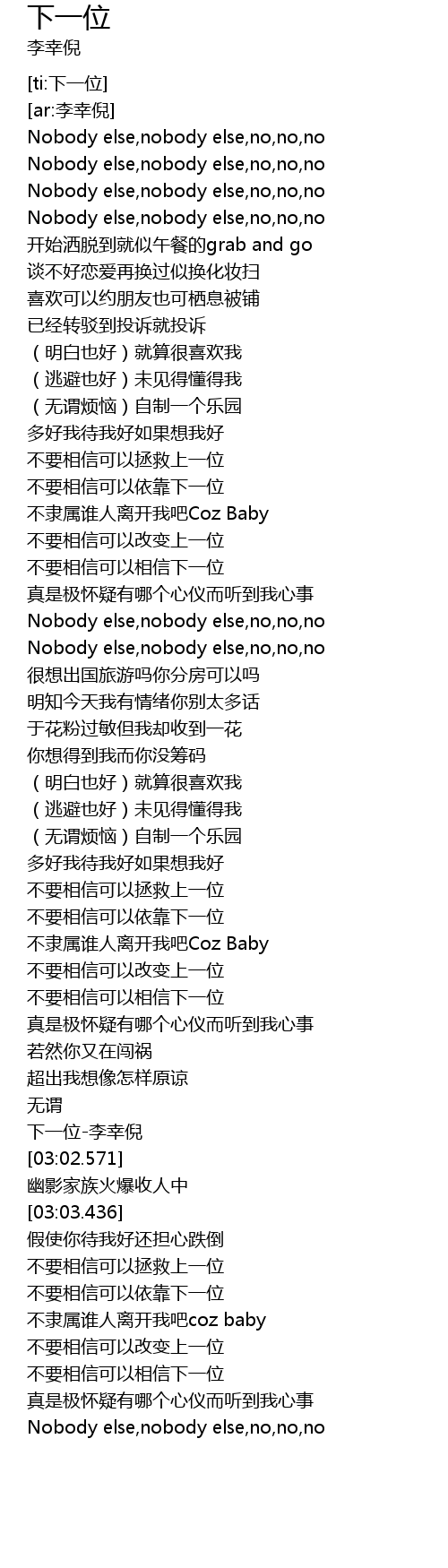 | [03:29.236] | Nobody else,nobody else,no,no,no |