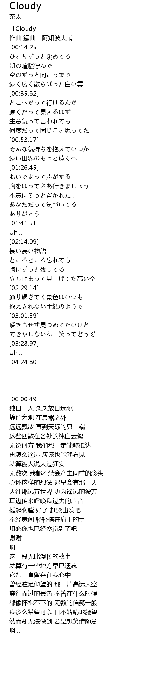 | [00:00.49] | 「Cloudy」 |