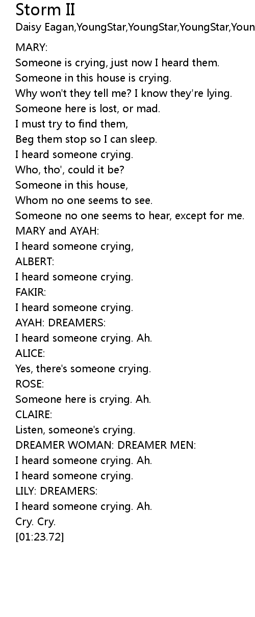 | [00:04.33] | Someone is crying, just now I heard them. |