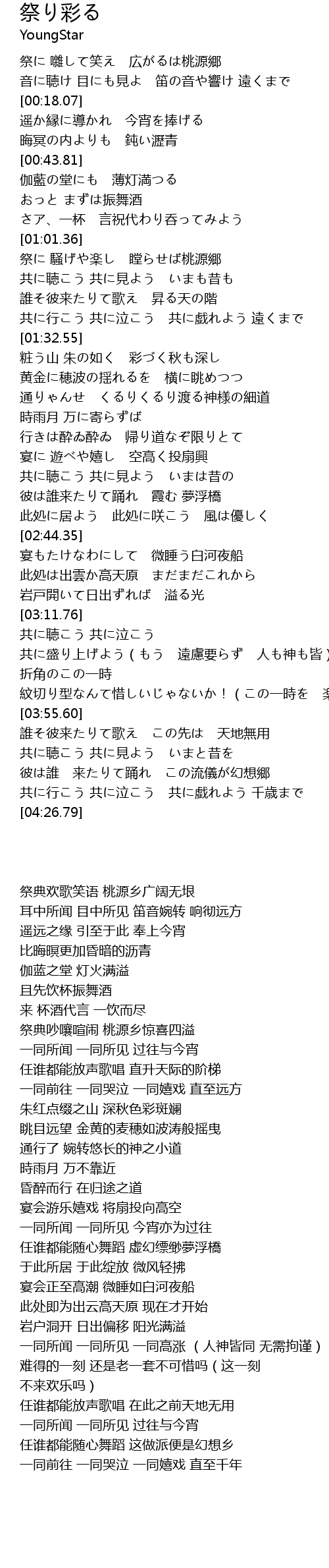 | [00:00.50] | 祭に 囃して笑え 広がるは桃源郷 |