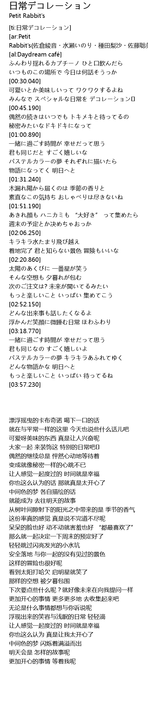 | [00:38.390] | みんなで スペシャルな日常を デコレーション♪ |