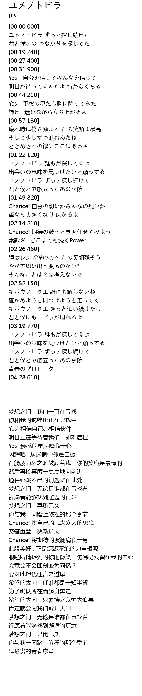| [03:56.190] | ユメノトビラ 誰もが探してるよ |