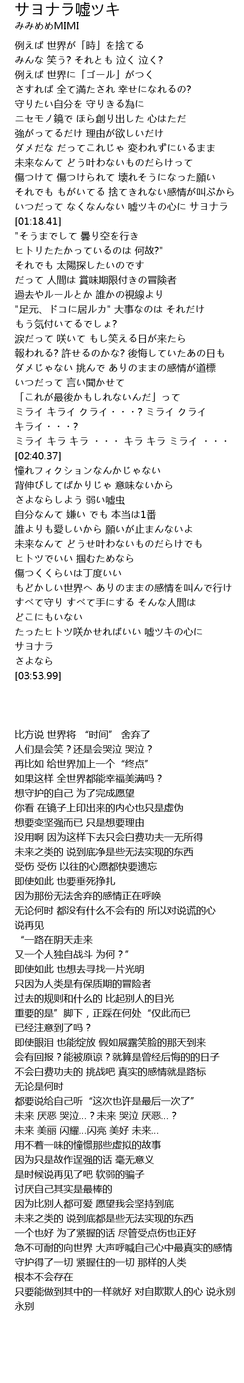 | [01:10.81] | いつだって なくなんない 嘘ツキの心に サヨナラ |