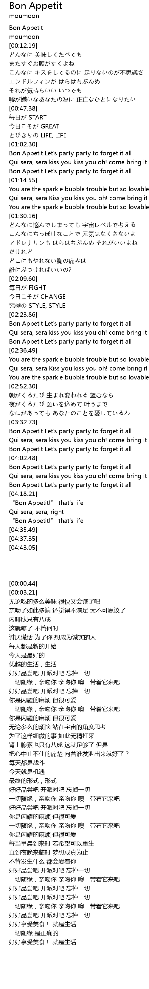 | [00:00.44] | Bon Appetit |
