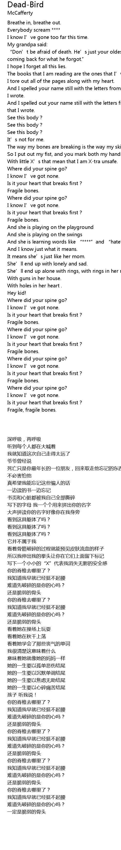 | [00:57.710] | The way my bones are breaking is the way my skin will bleed. |