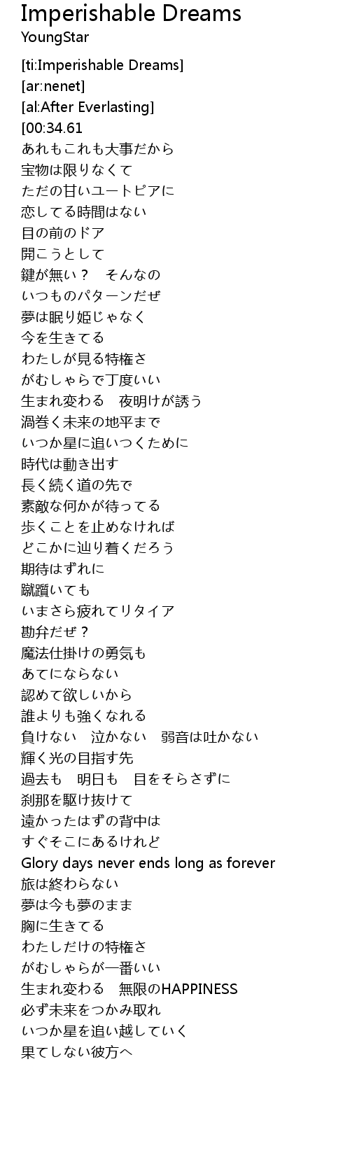 | [03:12.33] | 生まれ変わる 無限のHAPPINESS |