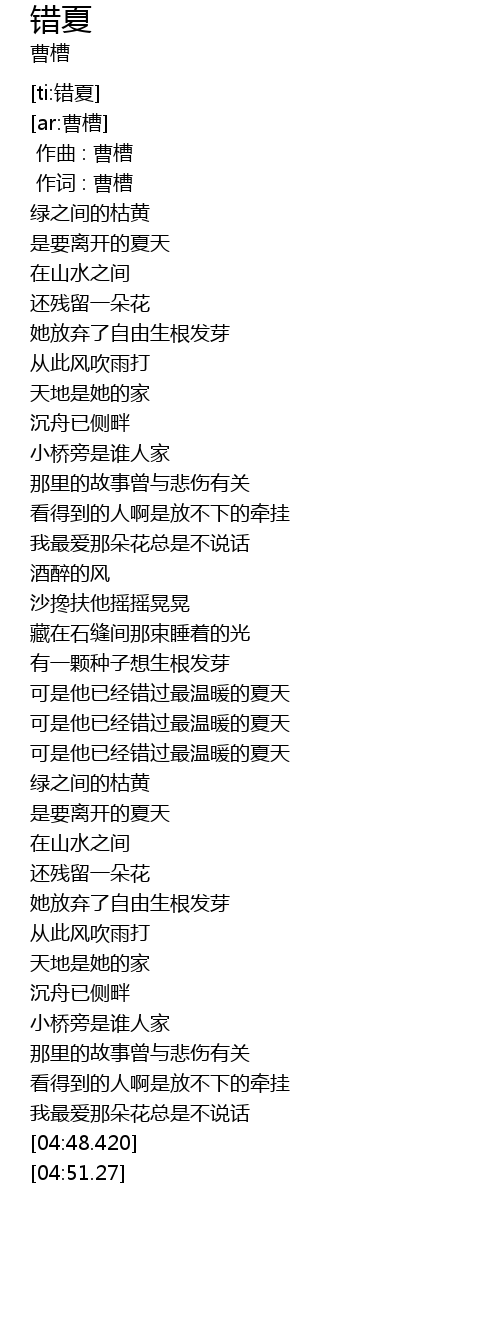 | [03:04.942] | ke shi ta yi jing cuo guo zui wen nuan de xia tian |