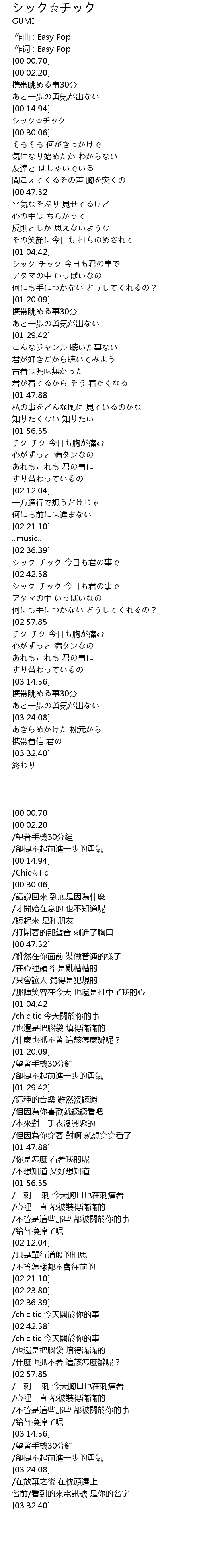 | [02:42.91] | シック チック 今日も君の事で |