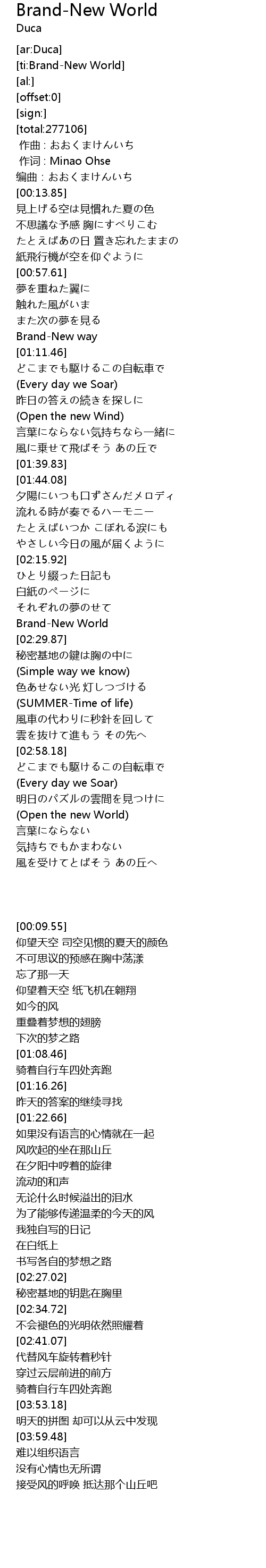 | [00:38.15] | 不思議な予感 胸にすべりこむ |
