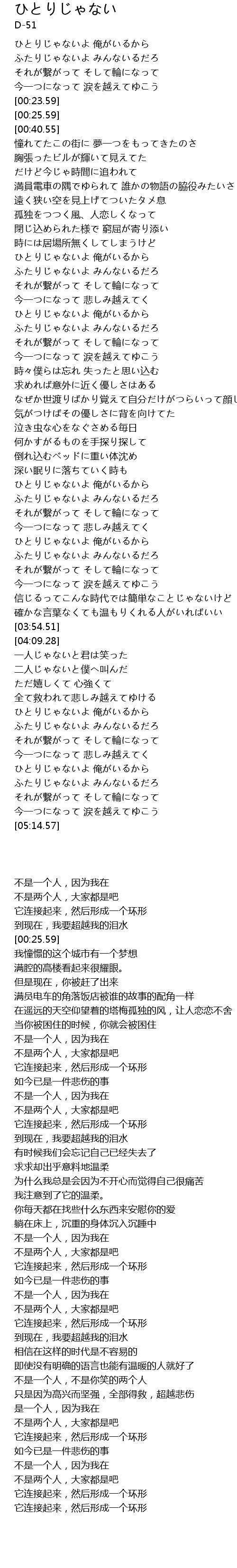| [00:00.00] | ひとりじゃないよ 俺がいるから |