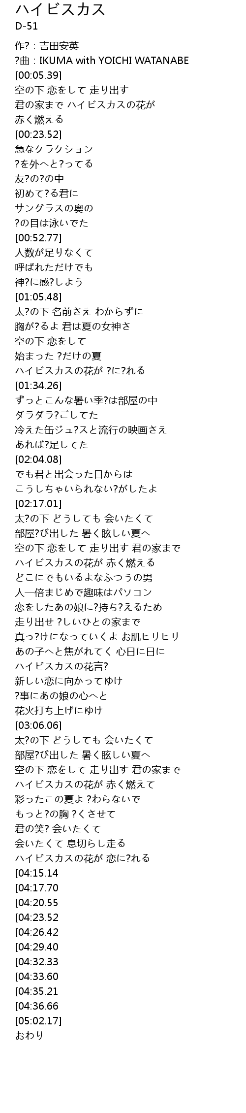 | [04:55.61][04:32.33] | ハイビスカスの花言? |