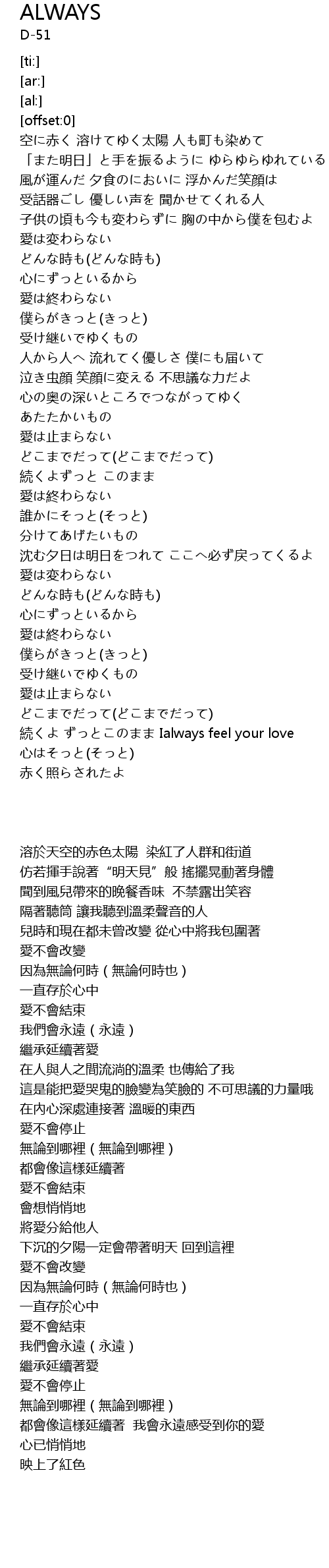 | [04:54.22] | 続くよ ずっとこのまま Ialways feel your love |
