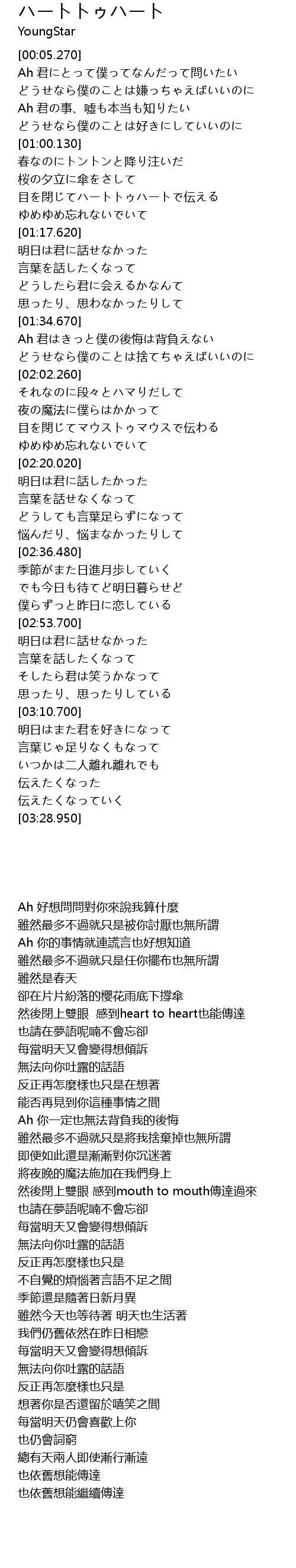 | [01:09.670] | 目を閉じてハートトゥハートで伝える |