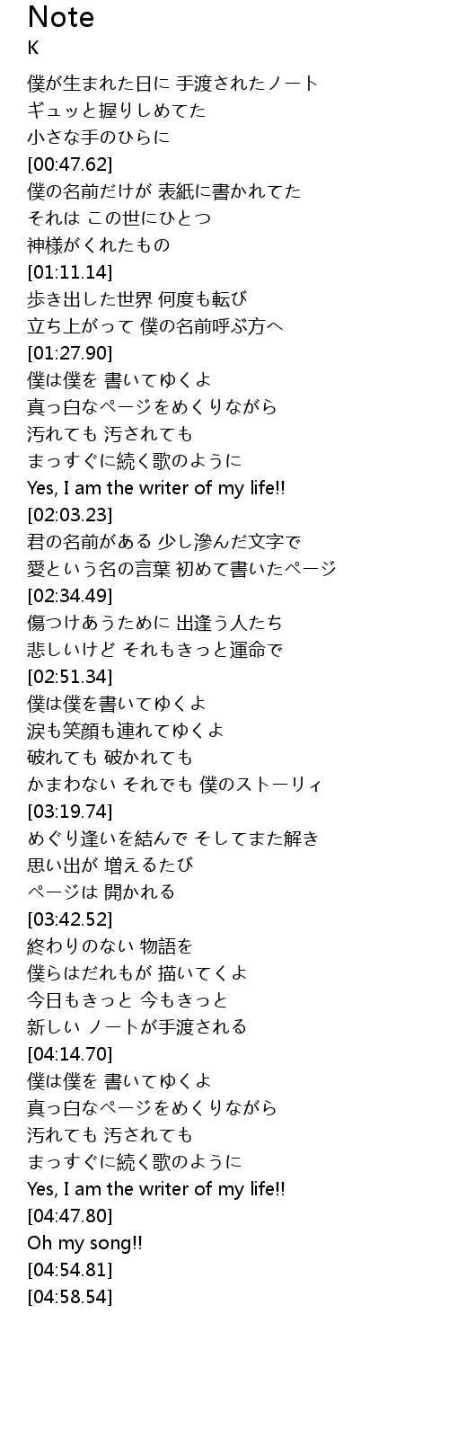 | [00:26.28] | 僕が生まれた日に 手渡されたノート |