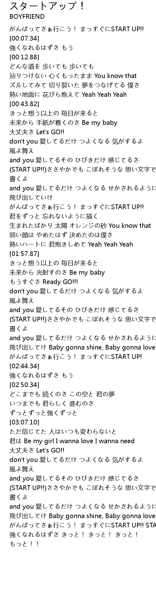 | [02:41.30] | がんばってさぁ行こう! まっすぐにSTART UP! |