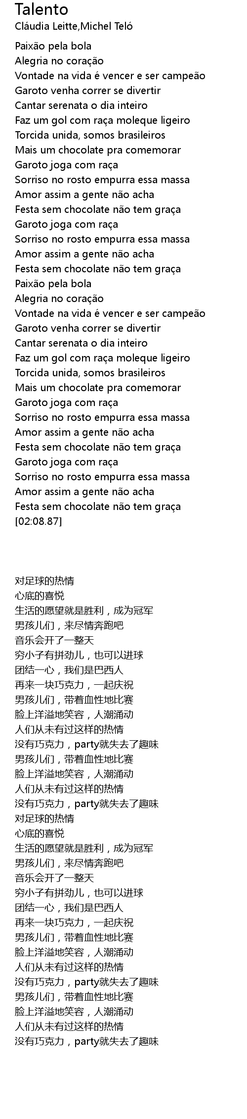 | [00:21.20] | Torcida unida, somos brasileiros |