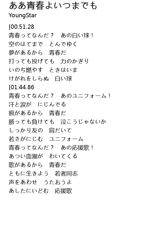 | [00:45.13][01:44.86][02:40.10] | ああ 青春よ いつまでも |