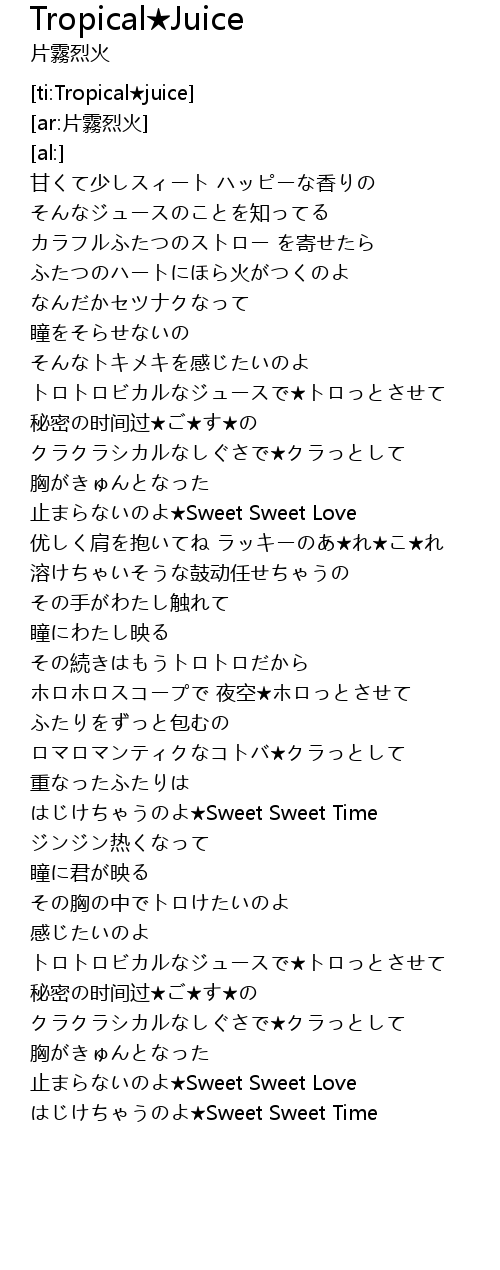 | [00:52.46] | トロトロビカルなジュースで★トロっとさせて |