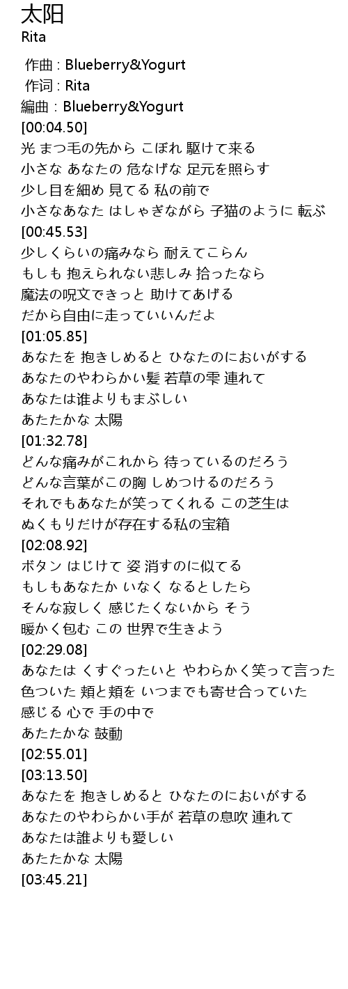 | [03:17.60] | あなたを 抱きしめると ひなたのにおいがする |