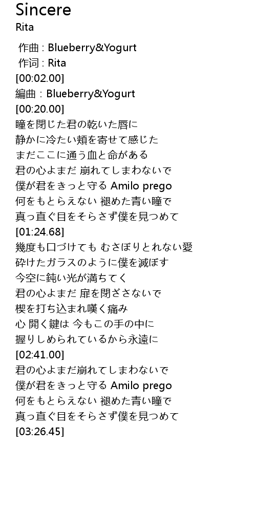| [03:03.69] | 僕が君をきっと守る Amilo prego |