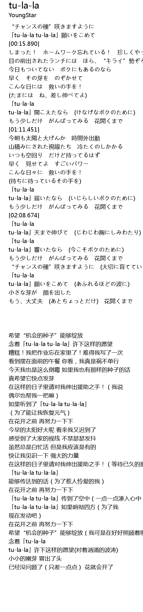 | [02:51.211] | “チャンスの種”咲きますように (大切に育てていくから) |