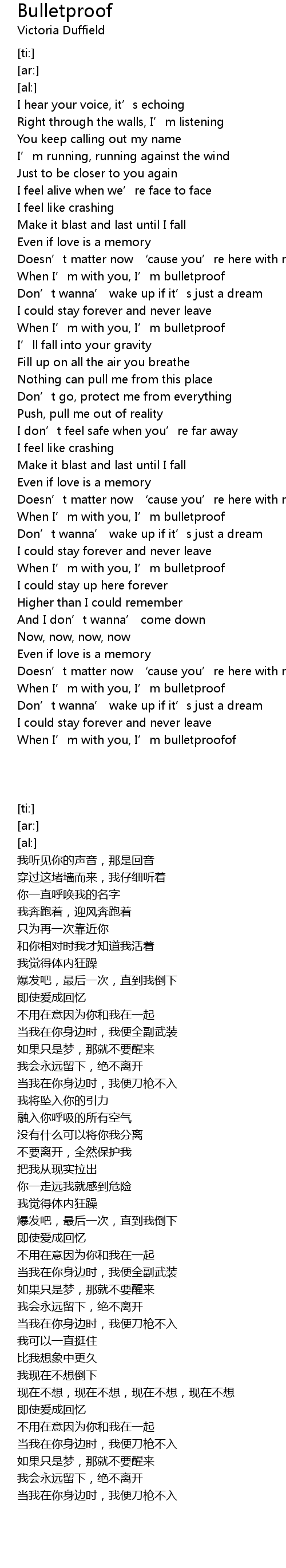| [00:55.28] | When I' m with you, I' m bulletproof |